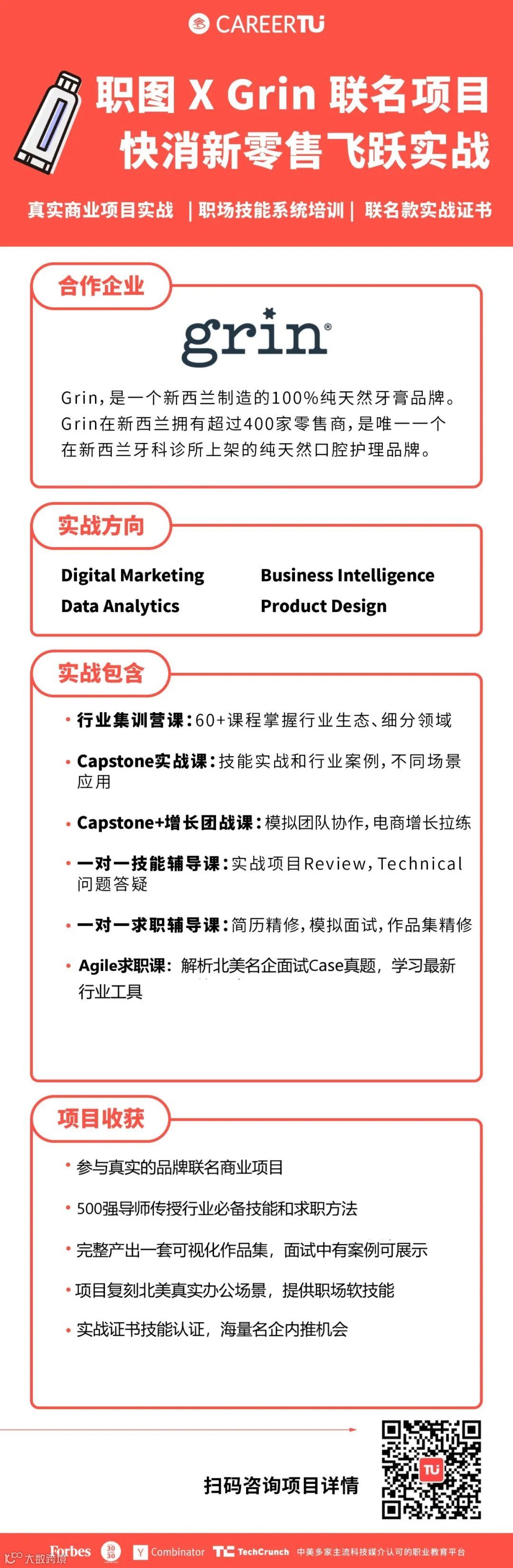 直接与电商企业Grin展开合作,深度参与CareerTu联名款商业化推广,获取高质量真实项目实操经历,为你之后求职以Amazon、Wayfair、L'Oreal、Everlane为代表的电商公司热招岗位奠定基础。 深度参与联名款线上商业化推广,掌握岗位必备工具的场景应用。