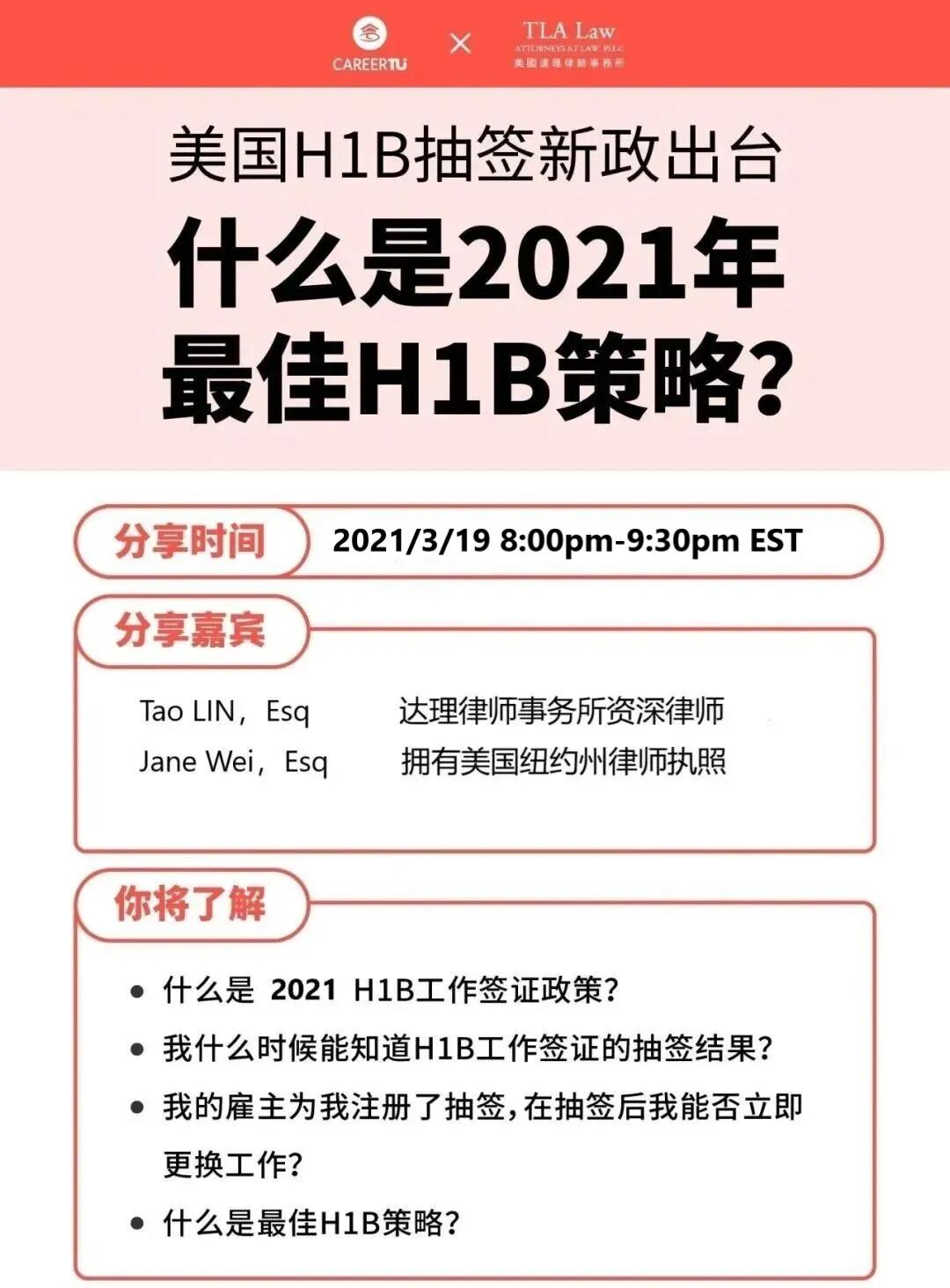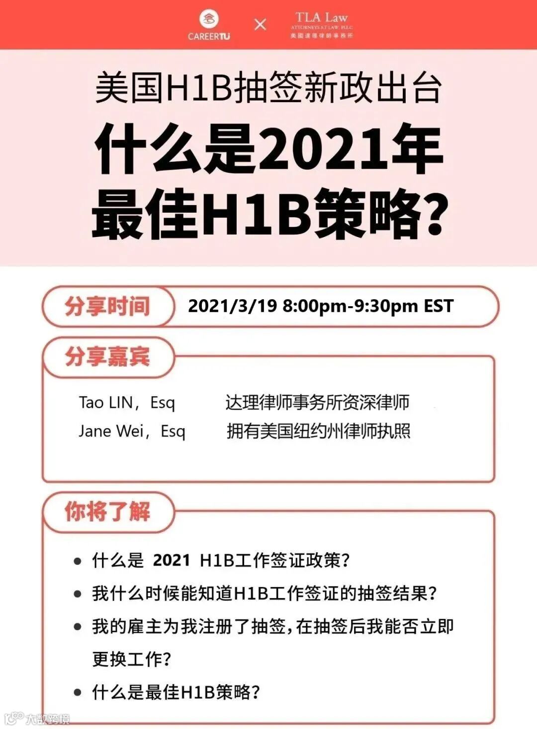 关于这些问题,专业律师来解答啦!3月19日,美国达理律师事务所将举行【美国H1B专场线上讲座】, 强烈建议正在求职/准备申请H1B的同学积极报名,热烈讨论!