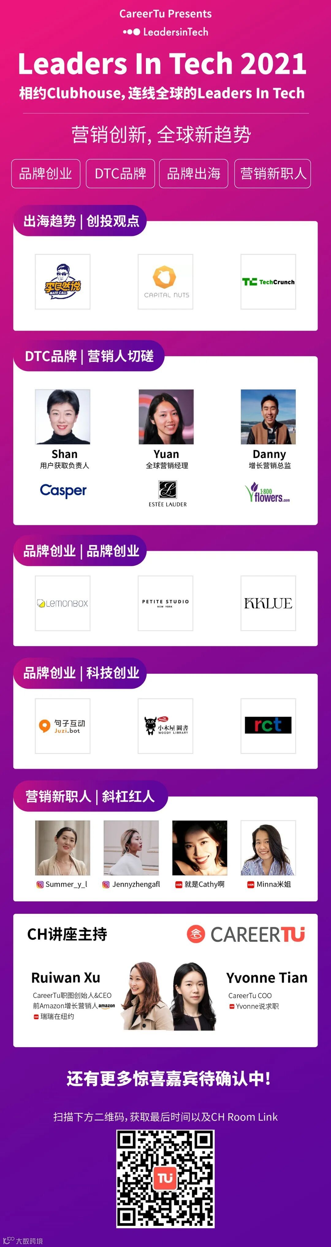 第四届Leaders In Tech Conference (未来科技领袖峰会),将于2月22日(周一)隆重举行!这一次我们相约硅谷最火的Clubhouse,连线全球的Leaders In Tech,探讨营销创新,全球新趋势!让距离不成问题!