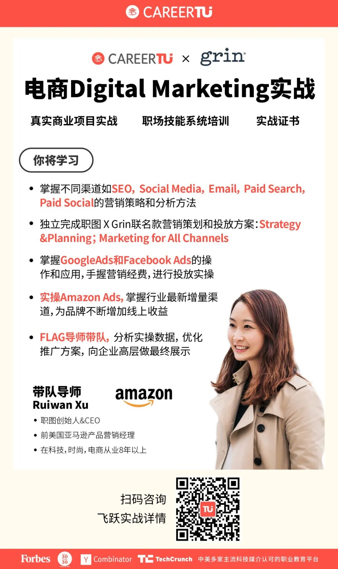 职图飞跃实战项目就是这样一个机会!在飞跃实战项目中,所有学员将直接上手参与职图×Grin联名款线上营销,在FLAG的资深导师带领下,巩固专业知识,学习Google Ads,Facebook Ads,进行Amazon Advertising的实操!学习不同渠道的营销策略和分析方法。另一方面,在实战项目中,你将积累高含金量作品集,丰富简历,面试有话讲!求职硬实力+背景提升,全面帮助你冲刺电商行业心仪Offer!