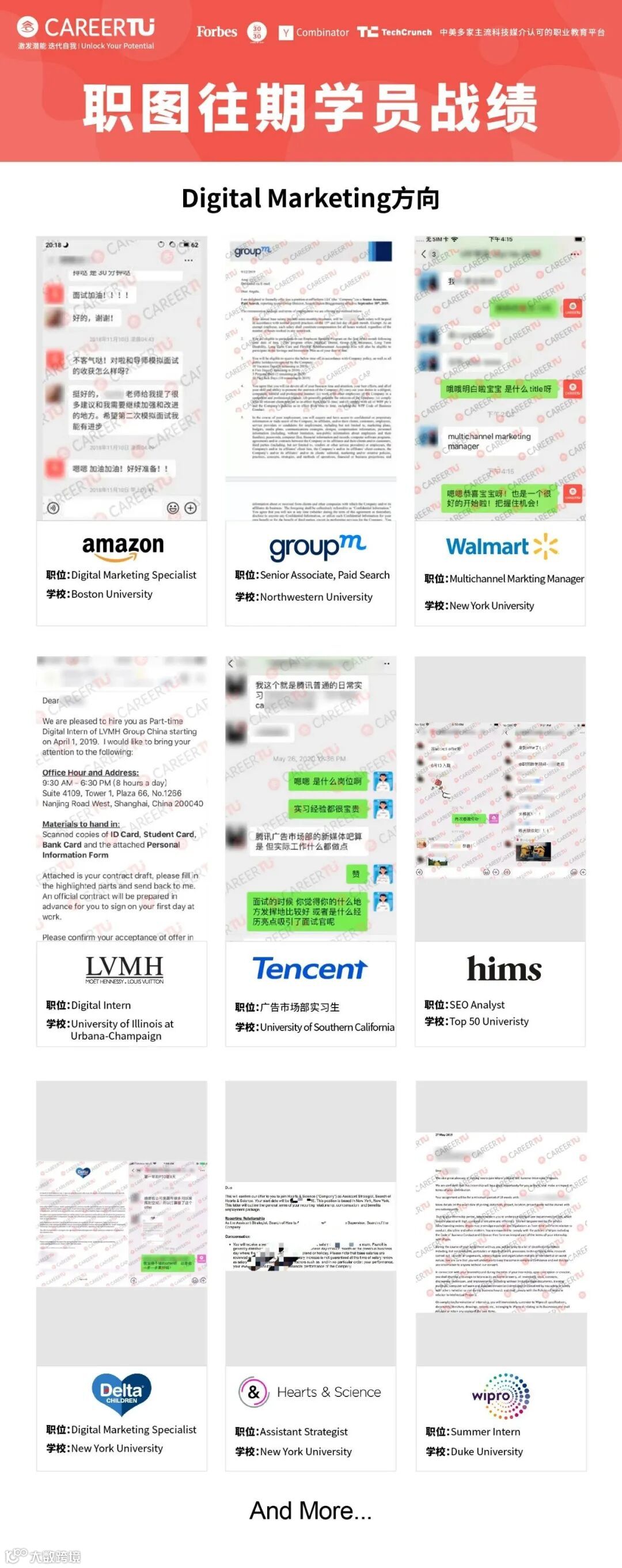 至今,CareerTu已经帮助很多同学斩获了Amazon、GroupM、Walmart、LVMH、Wayfair等知名互联网、电商企业Digital Marketing相关岗位全职Offer。