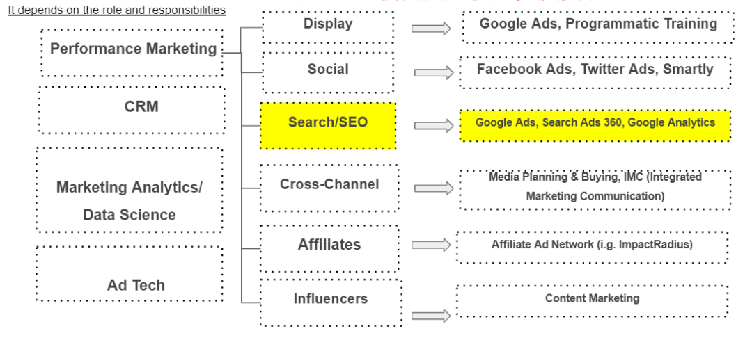 A broad marketing concept, usually includes PMM/Performance Markerting/CRM/Marketing Analytics/Ad Tech Roles