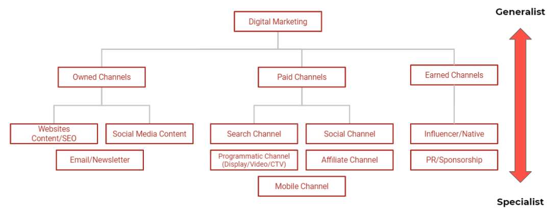 Digital Marketer could be channel specific (display/video/search) or BU/product line specific (managing multiple channels together), depending on the size of the company and the R&R setup within the company