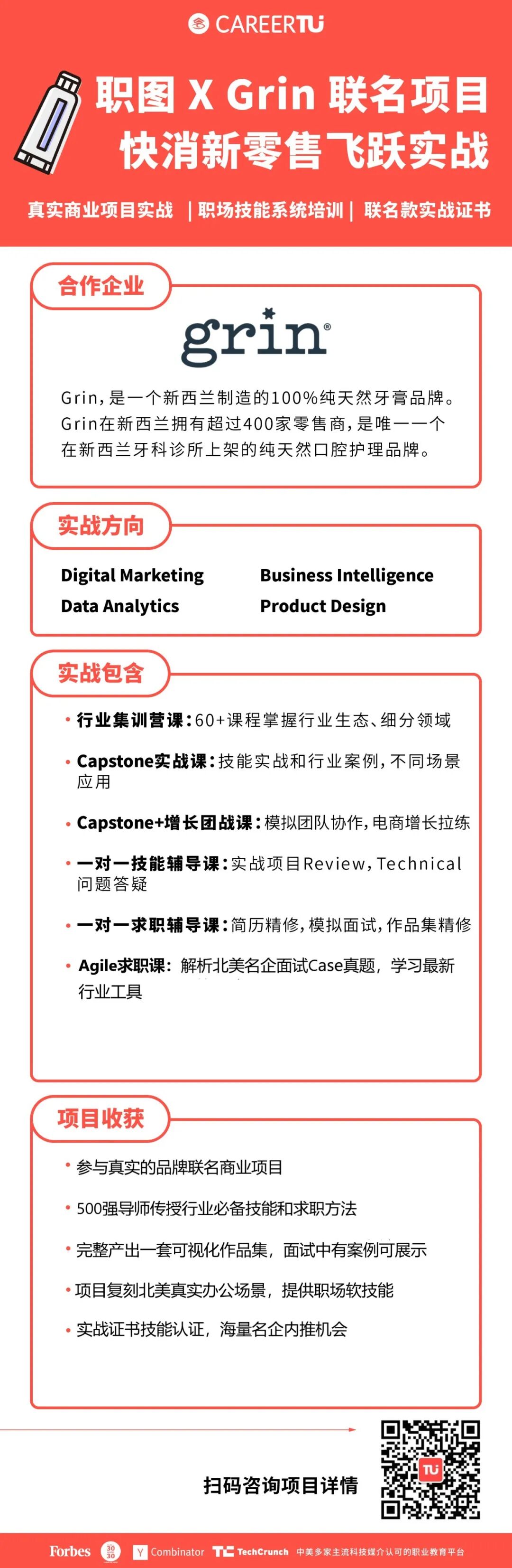 在本次飞跃实战项目中,所有学员将直接上手参与职图×Grin联名款线上营销,在FLAG的资深导师带领下,手握营销经费进行实操,巩固专业知识!另一方面,在实战项目中,你将积累高含金量作品集,丰富简历,面试有话讲!求职硬实力+背景提升,全面帮助你冲刺心仪Offer!
