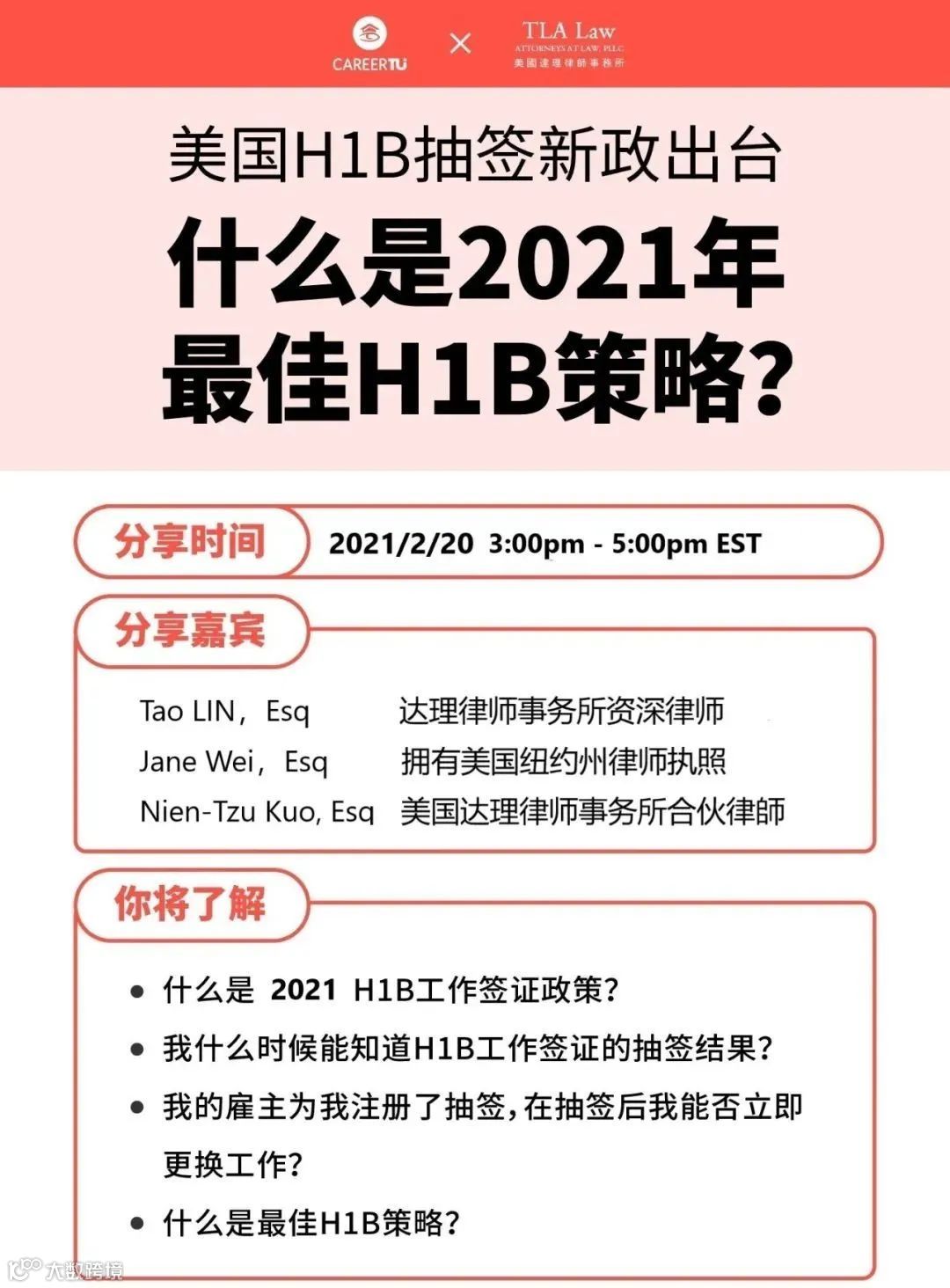 关于这些问题,专业律师来解答啦!2月20日,美国达理律师事务所将举行【美国H1B专场线上讲座】, 强烈建议正在求职/准备申请H1B的同学积极报名,热烈讨论!