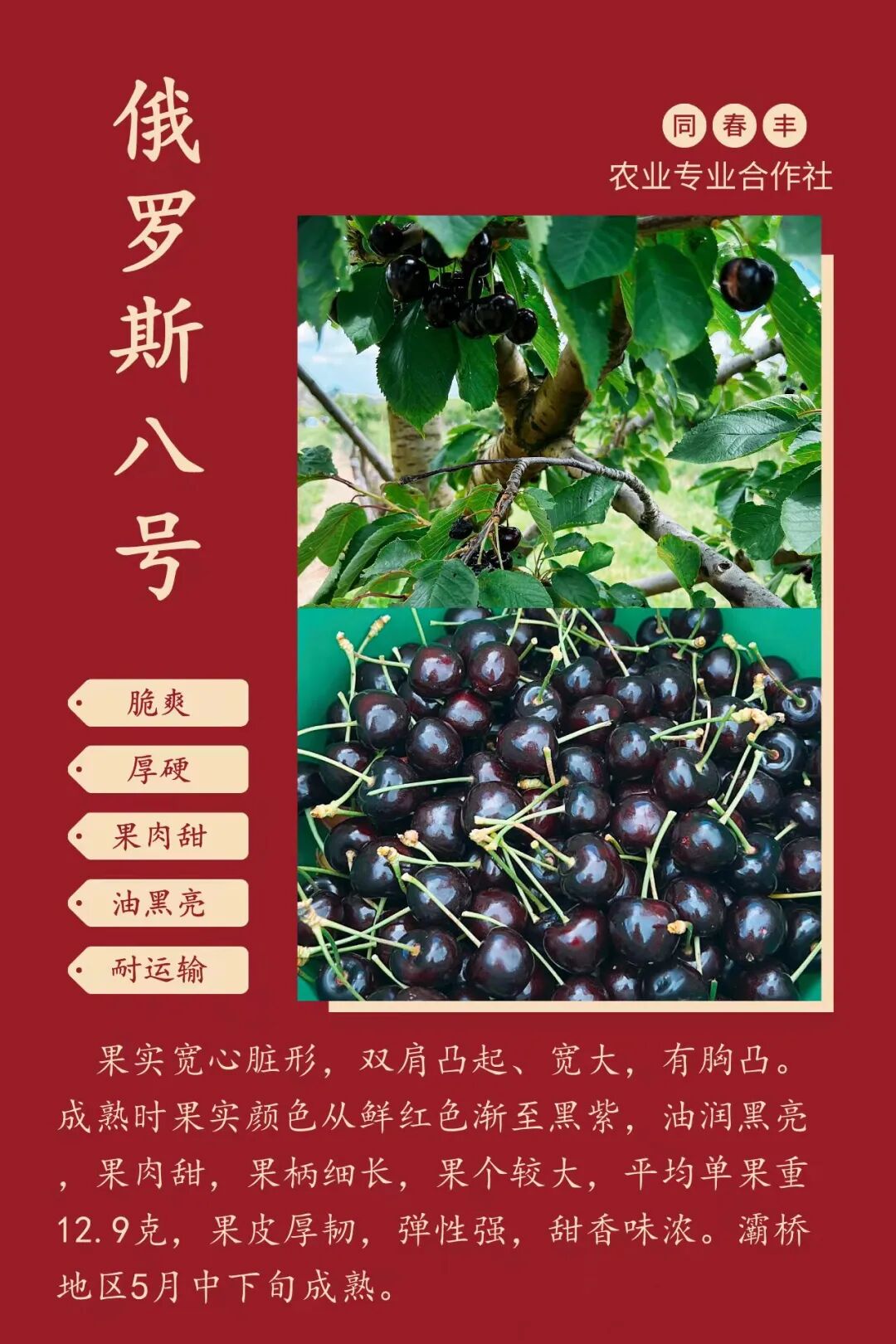 俄罗斯八号:脆爽、厚硬、果肉甜、油黑亮、耐运输。果实宽心脏形,双肩凸起、宽大,有胸凸。成熟时果实颜色从鲜红色渐至黑紫,油润黑亮果肉甜,果柄细长,果个较大,平均单果重11.9克,果皮厚韧,弹性强,甜香味浓;