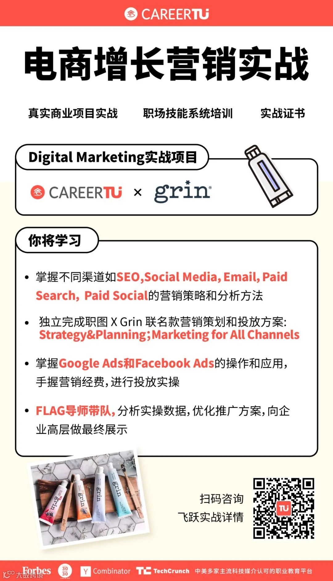 在本次飞跃实战项目中,所有学员将直接上手参与职图×Grin联名款线上营销,在FLAG的资深导师带领下,手握营销经费进行实操,巩固专业知识!另一方面,在实战项目中,你将积累高含金量作品集,丰富简历,面试有话讲!求职硬实力+背景提升,全面帮助你冲刺心仪Offer!