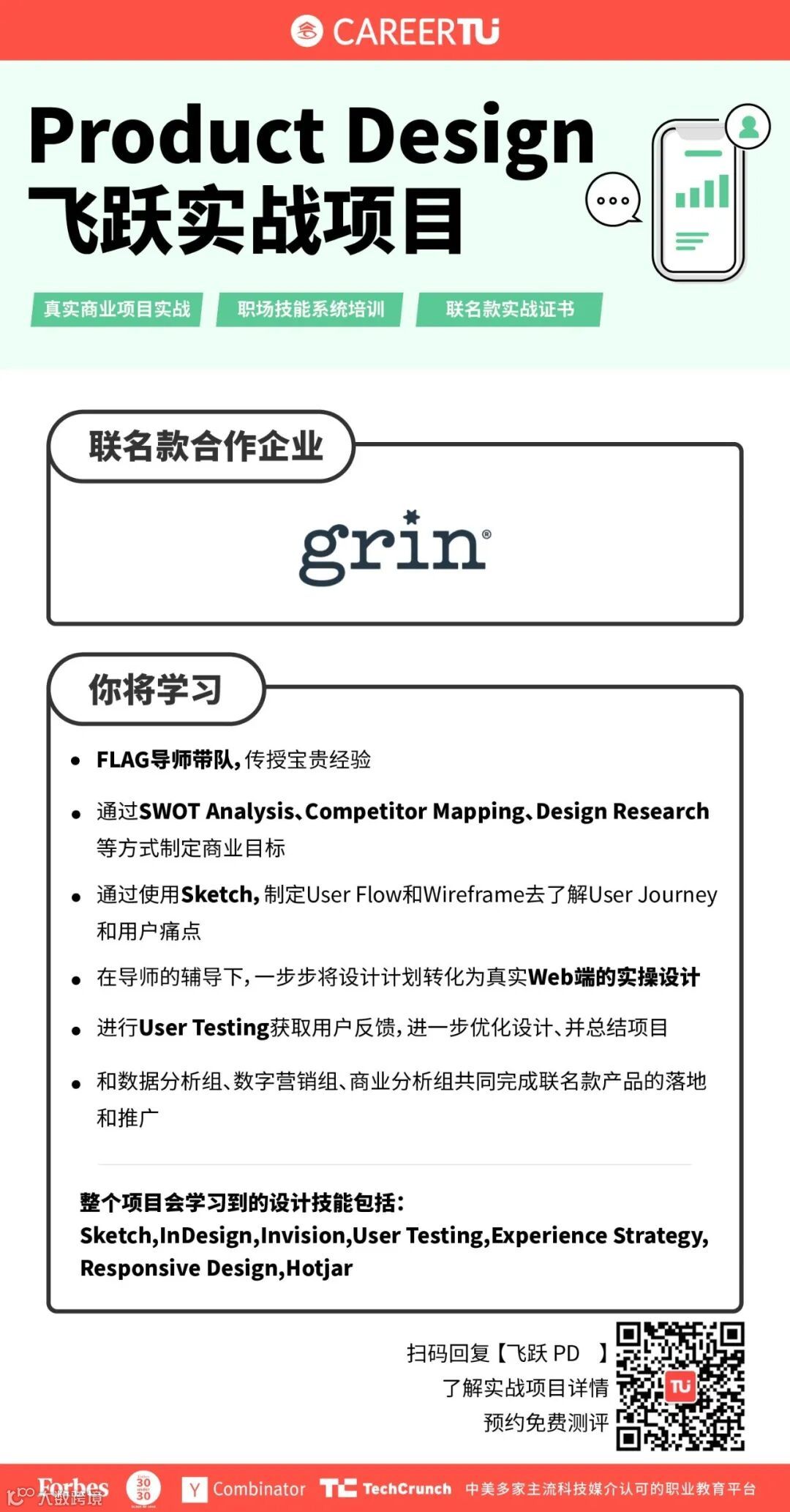 在本次飞跃实战项目中,所有学员将直接上手参与职图×Grin联名款商业化推广,在FLAG的资深导师带领下,巩固专业知识!另一方面,在实战项目中,你将积累高含金量作品集,丰富简历,面试有话讲!求职硬实力+背景提升,全面帮助你冲刺心仪Offer!