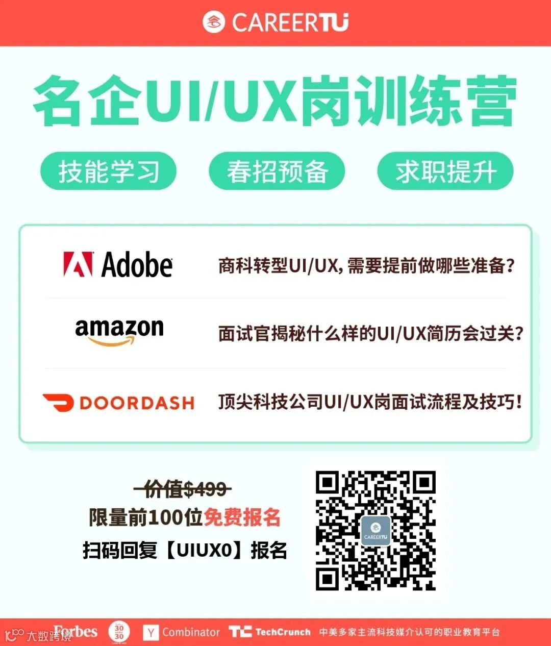 本月,职图举办名企UI/UX岗训练营,来自Adobe、Amazon、DoorDash的导师将分享:从转行UIUX需要做的准备,到简历、面试求职宝典。全方位帮助你完成技能学习和求职提升!