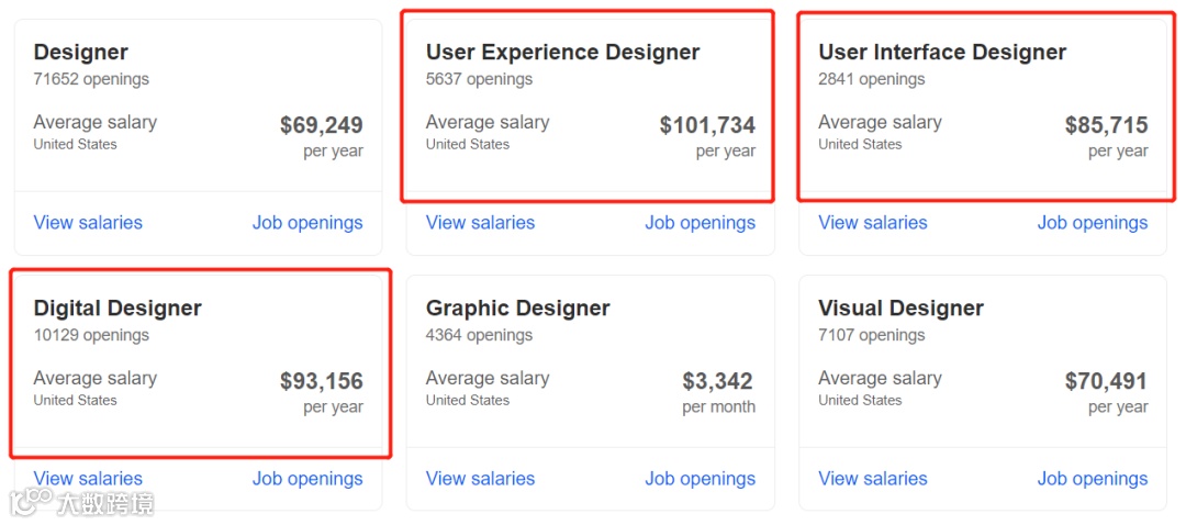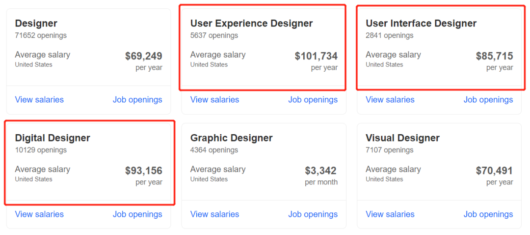 在类似职位中,各个设计岗位的薪资差异其实还挺大的,从$3,342到$101,734的跨度。而随着数字化的加速,电商飞速发展,用户体验设计、数字化设计岗位的薪资都比传统的平面设计、视觉设计薪水要高的多,这也成为近几年设计专业同学选择求职的热门方向。