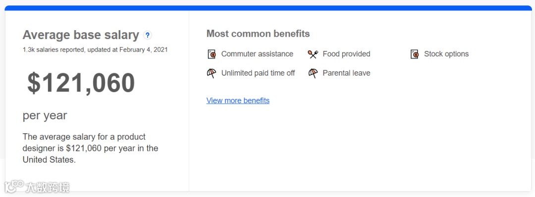 据Indeed发布的数据,截止2021年4月,产品设计师的平均年薪在$121,060。