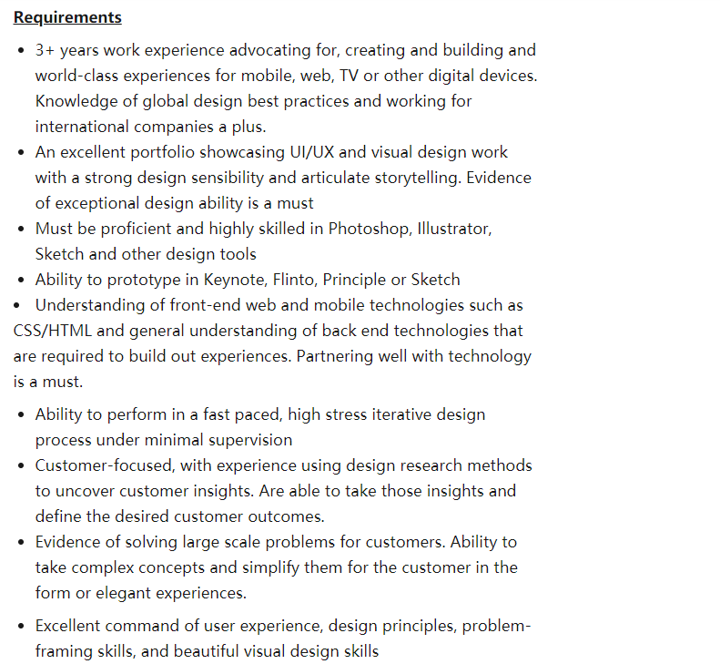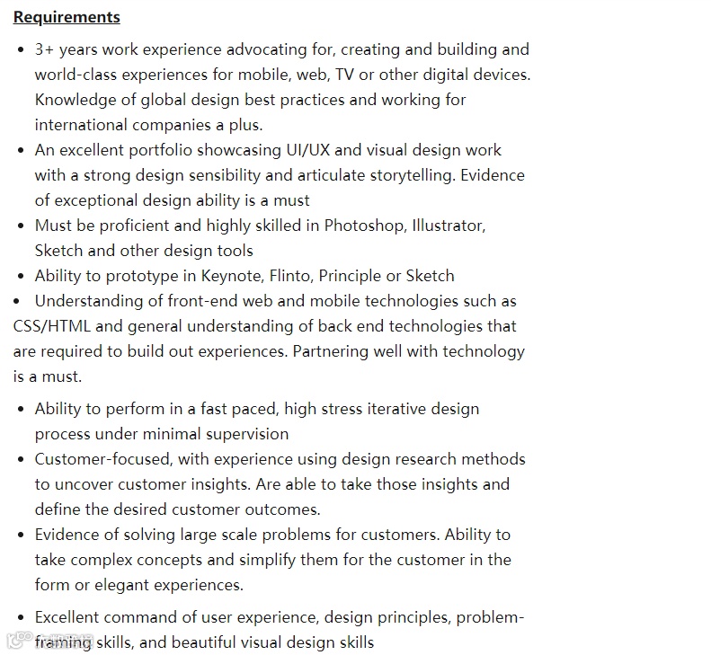 其次,在疫情的催化下,企业招聘就更偏向于能快速上手的人才,可以省掉很多培训时间,快如为公司创造价值,因此,最直接的就是对过往经验的要求更高了,因为过往经验往往最能直观的看出你具备的能力,以及现阶段可以完成的工作内容。所以我们常常看到不仅是全职产品设计师了,就连Intern都希望有过实习的经历,有真实的作品Launch出来。