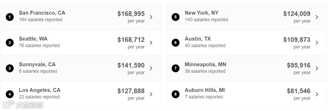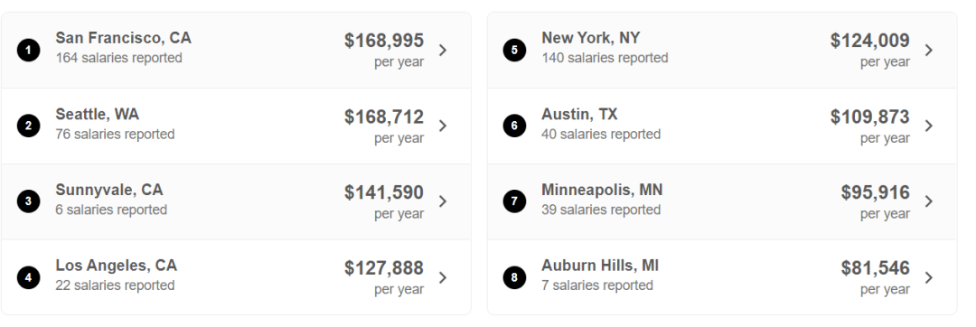 不同地区的产品设计岗也存在薪资差异,其中旧金山和华盛顿的薪资水平最高,均在年薪$168,000以上。这也取决于很多科技公司都分布在旧金山等地区。