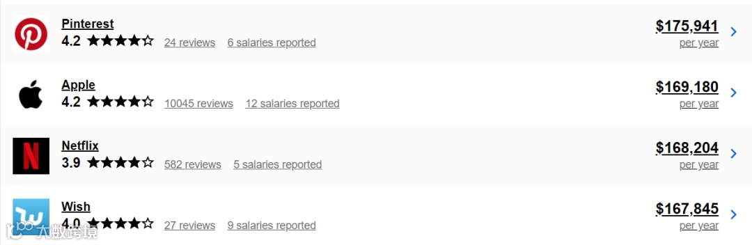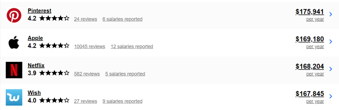 从下图可以看出,Facebook,Twitter,Pinterest,Apple,Wish等大厂都为产品设计岗除了高薪的薪资,从年薪$160,000到$193,055不等,其中Facebook位列榜首。对于准备求职的留学生来说,求职冲刺大厂依然是一个很[值]的选择。