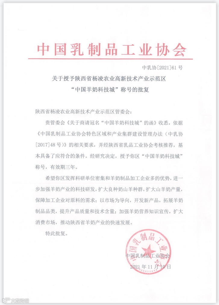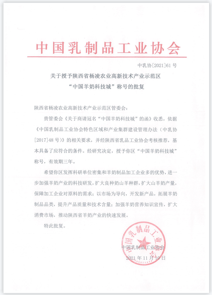 近日,中国乳制品工业协会批复授予杨凌示范区“中国羊奶科技城”称号。此项荣誉的获得是杨凌示范区深入贯彻落实国务院《批复》要求,实施“健康中国”“乡村振兴”“奶业振兴”战略的具体行动,标志着杨凌示范区依托技术优势、创新优势、良种优势以及加工优势,推动奶山羊全产业链高质量发展取得了显著成效。