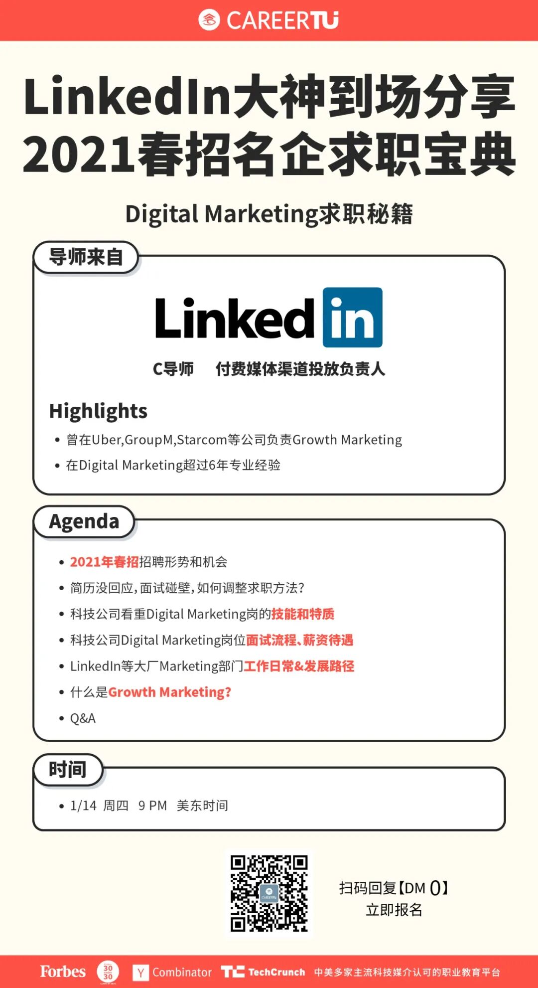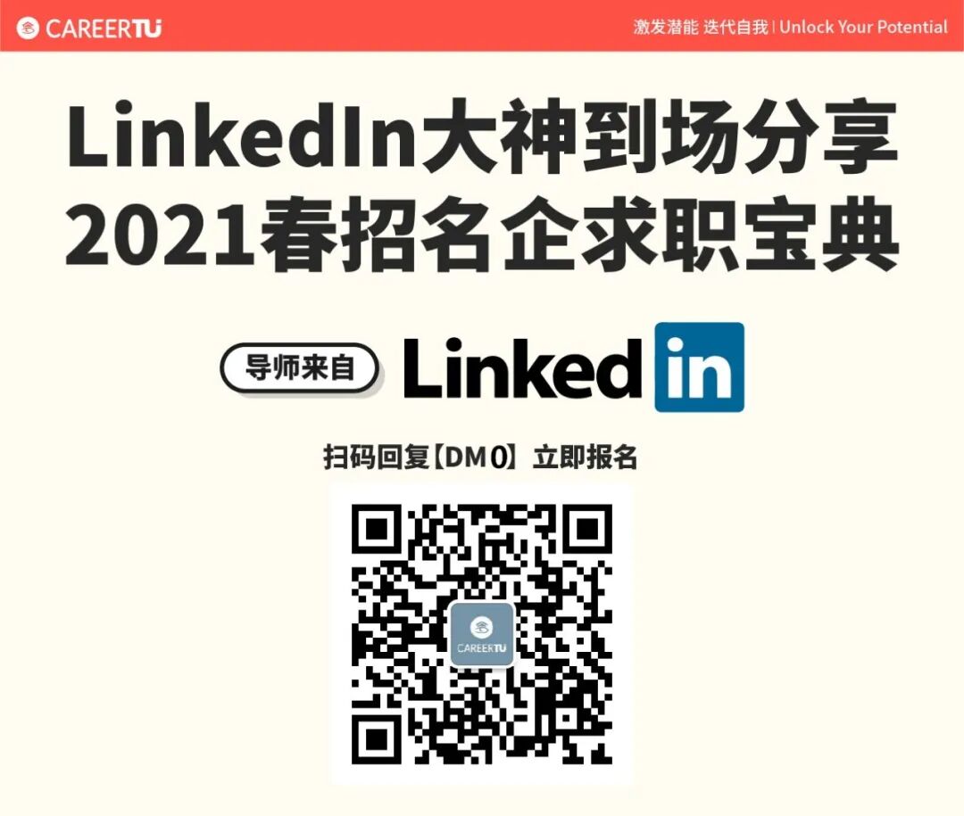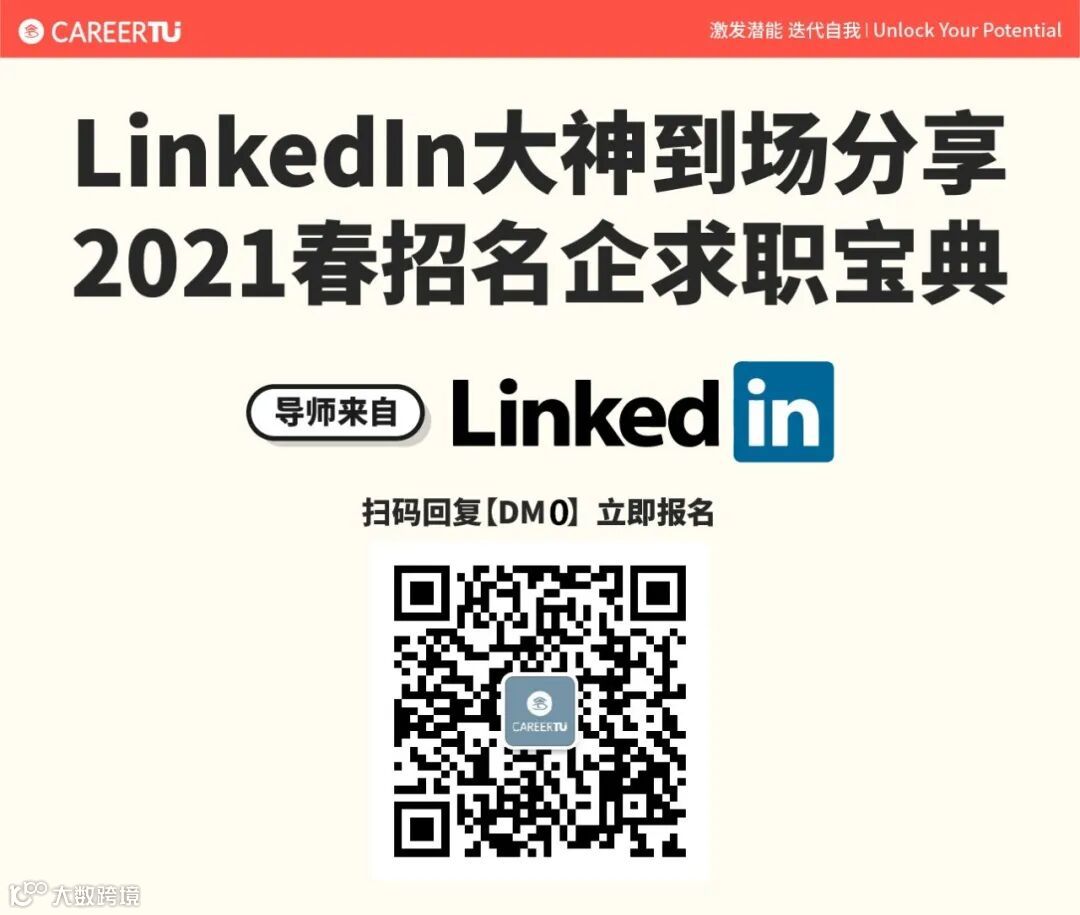 想听更多前辈分享?想了解春招招聘趋势和大厂的面试流程?美东时间1月14日9PM,LinkedIn大神将分享2021春招名企求职宝典!席位仅开放40个,报完即止哦!