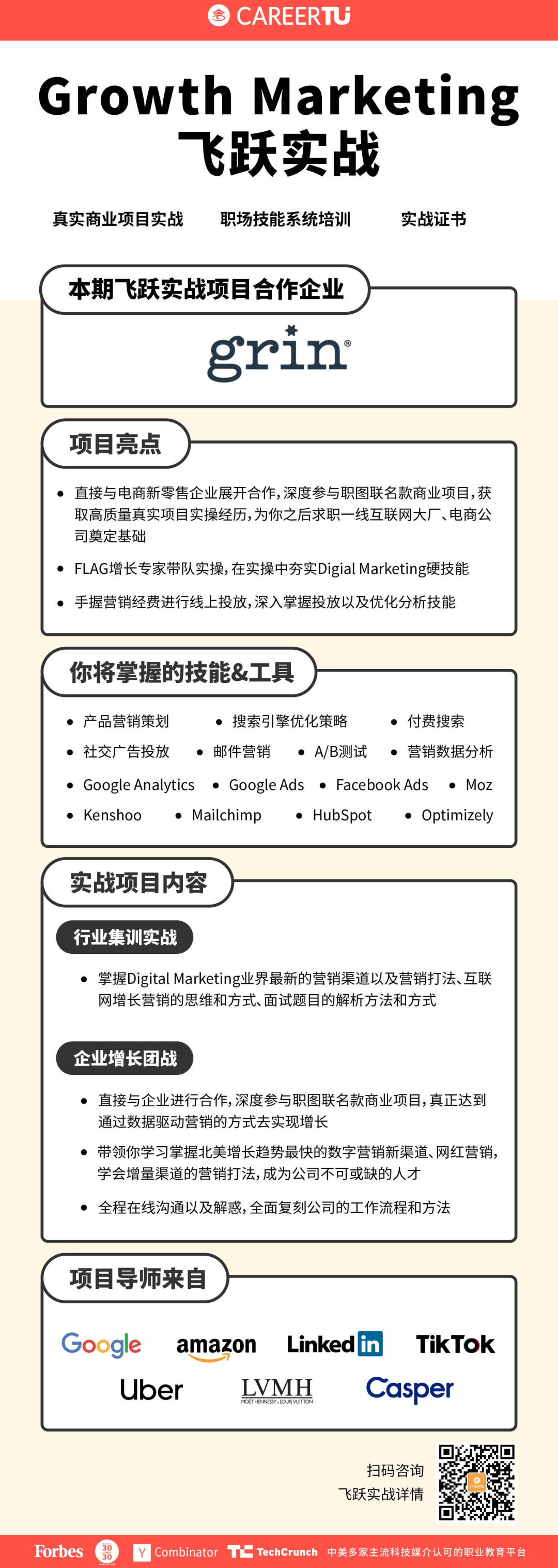 如果你想进入到数字营销领域工作,但发现自身在相关的专业技能、相关的行业经验有所欠缺,那么职图和新零售电商企业深度合作的独创飞跃实战项目将将在最大程度上帮助上你,提升你的求职力!