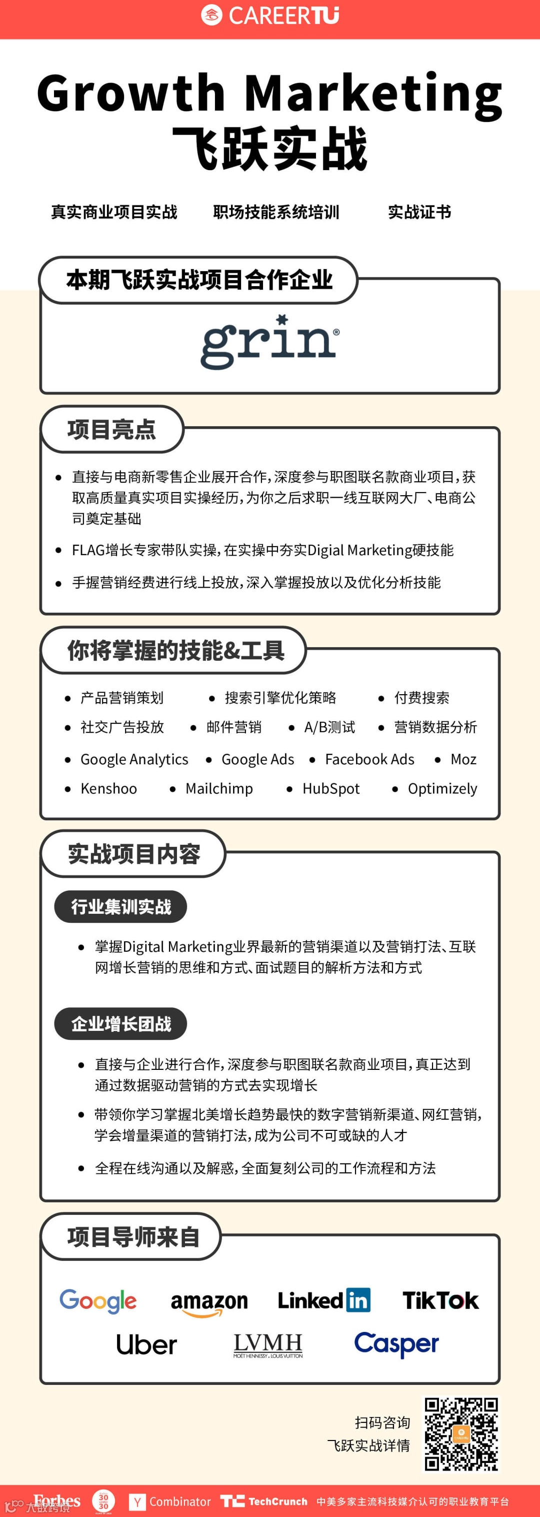 一方面飞跃实战项目中,你将由来自FLAG的资深导师带队手把手护航,让你手握营销经费进行实操,在真实的商业项目中巩固专业知识!另一方面,在实战项目中,你将积累高含金量作品集,丰富简历,面试有话讲!求职硬实力+背景提升,全面帮助你冲刺心仪Offer!