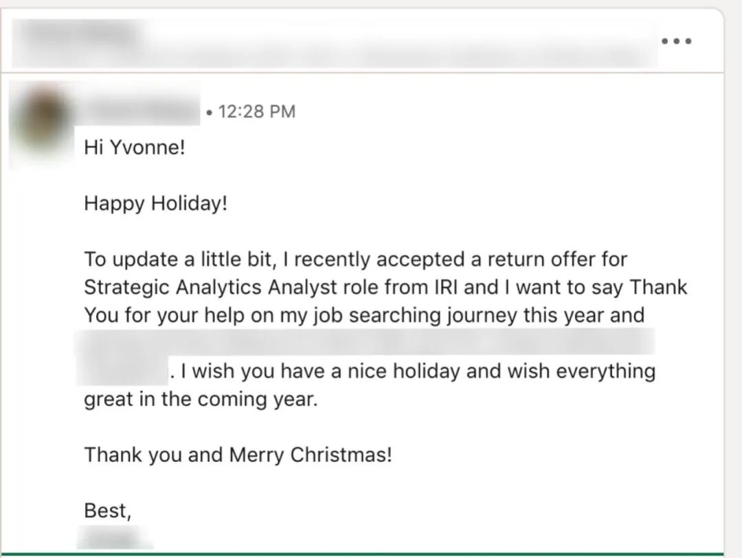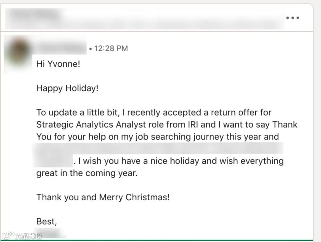 在刚刚过去的圣诞节中,我们也收到了我们学员的好消息:有20级的校友回来说拿下了暑期实习的Return Offer,锁定了全职工作!而她也是从传媒转行进入的互联网领域。