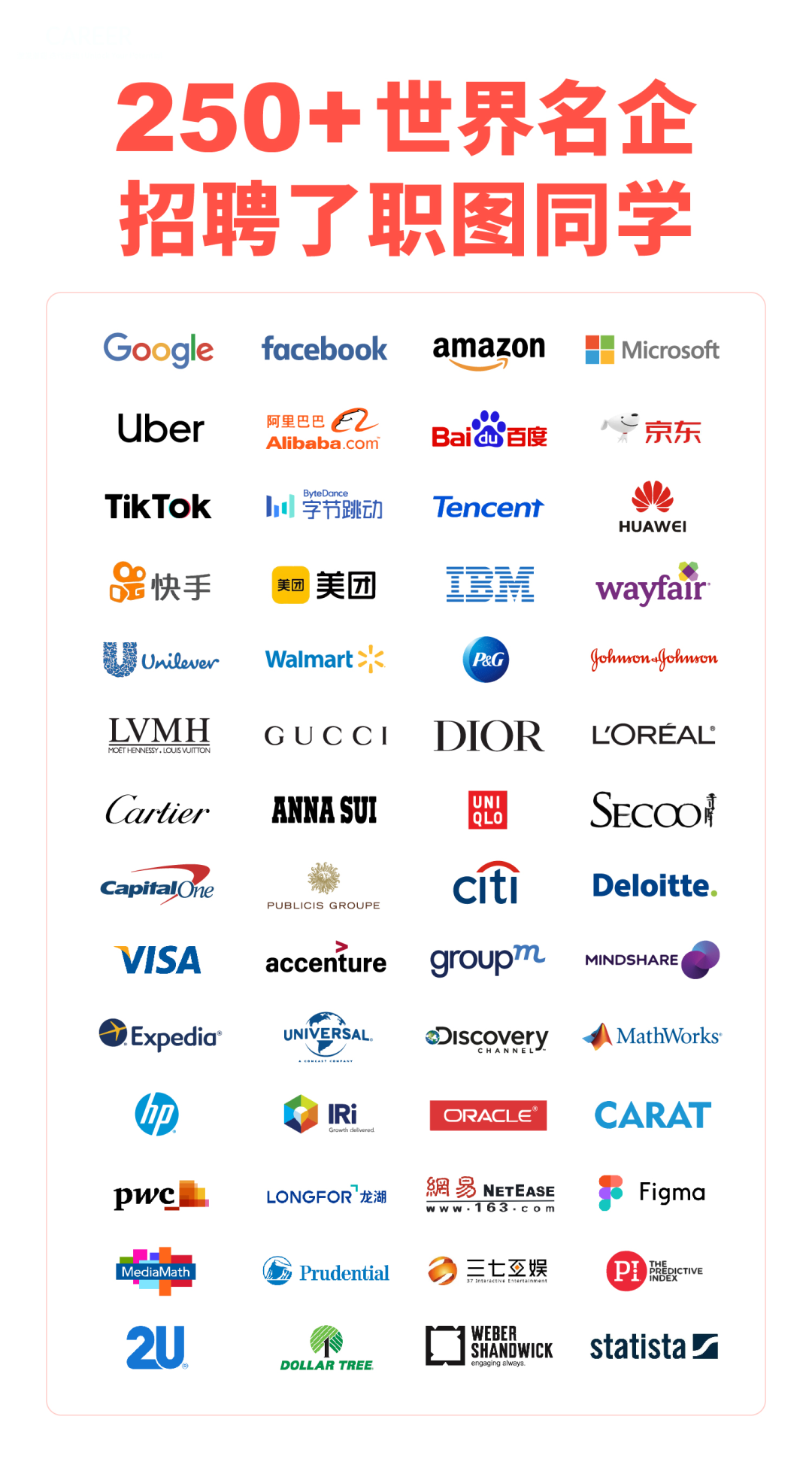 ● 面试冲刺:职图导师将模拟Hiring Manager在模拟面试中指出学员面试中存在的问题和不足,同时教授面试攻略。并帮助学员理解面试问题背后公司希望考察学员的哪些素质和能力,做到知己知彼。