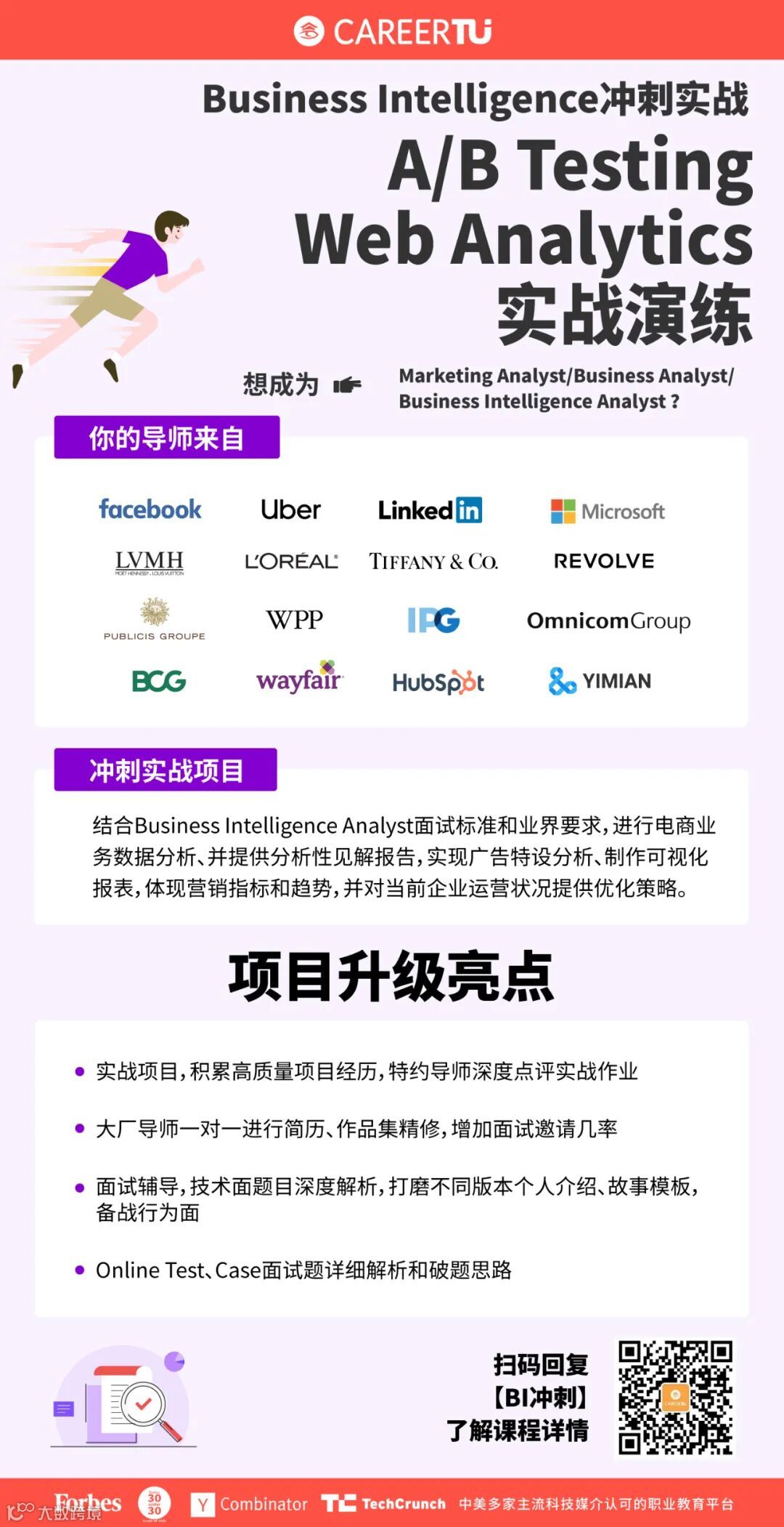 实战项目结合Business Intelligence Analyst面试标准和业界要求,你将会完成为电商业务情况数据分析、并提供分析性见解报告,实现广告特设分析、制作可视化报表,体现营销指标和趋势,并对当前企业运营状况提供优化策略,掌握 SQL、Python、R、Optimizely等必备工具。 分析企业网站数据, 提出增长建议。