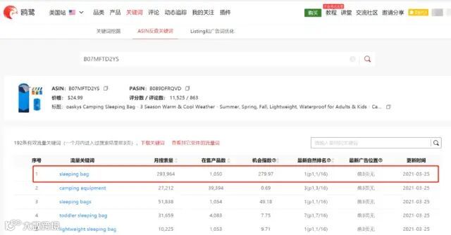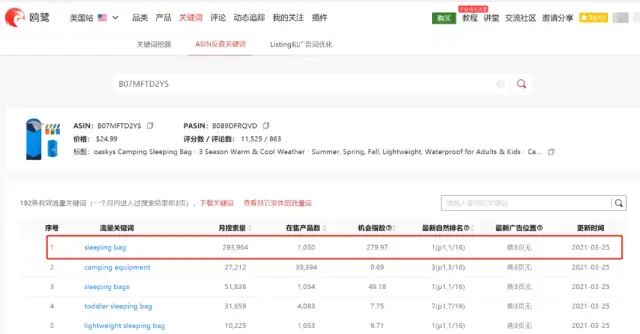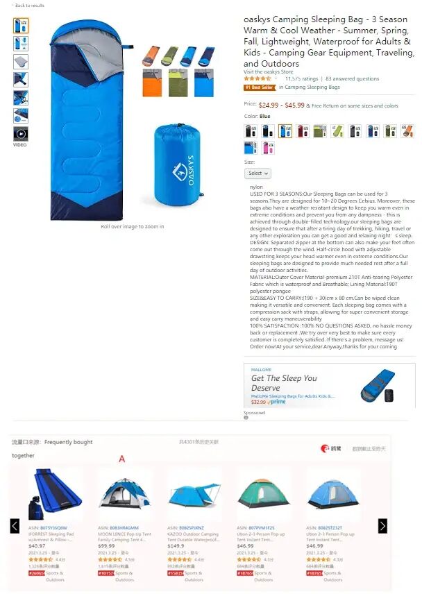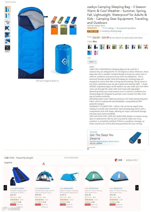 可以看到,同类产品:睡袋 和互补产品:帐篷 都曾经为这款睡袋引过流。前述的A款帐篷也位列其中,印证了其中的关联关系。
