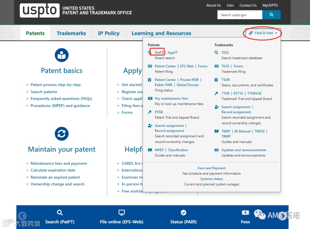 2. 美国专利商标局(https://www.uspto.gov/)查询(可查询到发明和外观专利哦) ,选择Find It Fast--PaFT