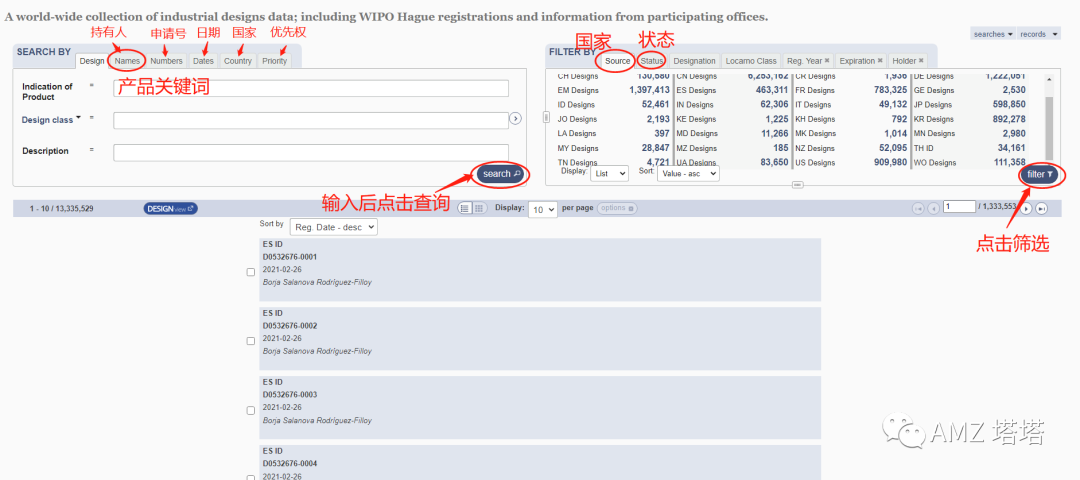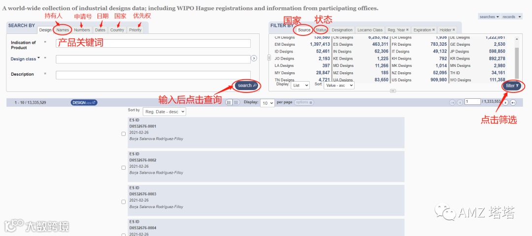 1. WIPO(https://www3.wipo.int/designdb/en/)快速查询全球外观专利,可使用产品关键词/申请人、申请号等方式: