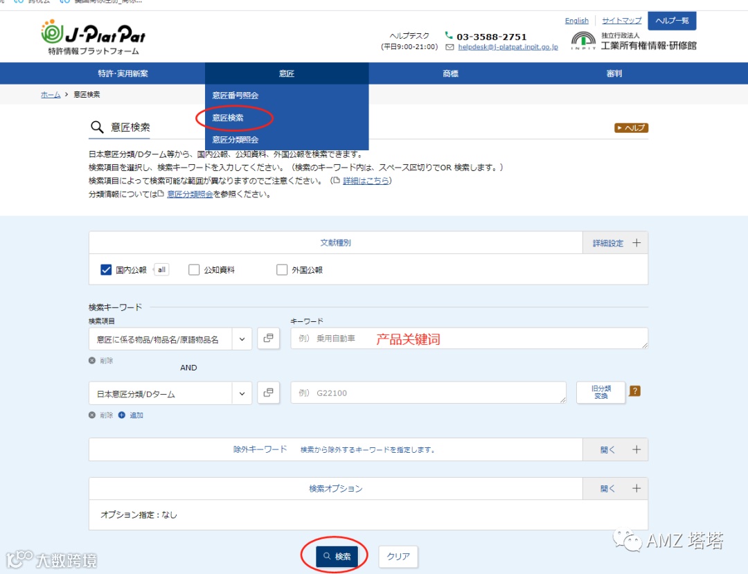 5. 日本外观专利查询可进入:https://www.j-platpat.inpit.go.jp/d0100,可输入产品关键词/专利号/申请人名称等进行查询