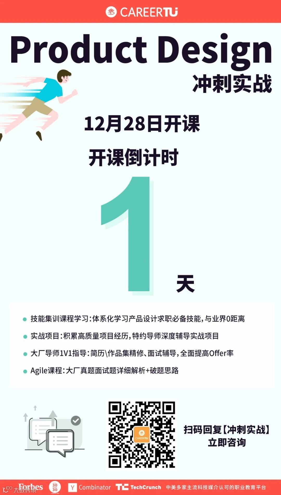 Product Design方向的冲刺实战,让你从用户调研到原型设计等知识框架,到行业趋势,最新工具,全方位掌握Product Design岗位必备技能,冲刺Offer! 项目以解决商业问题为前提,包含定义用户目标,完成痛点分析,Figma设计和创建原型图等关键环节,完成迭代网页设计。