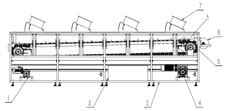 本实用新型公开了一种水果重量外观及内部品质分选设备,该设备主要由提升喷淋系统、风干抛光系统、干式上料口、视觉检测处、称重系统、内部品质检系统、悬挂输送带以及人工包装台组成;该水果重量外观及内部品质分选设备,通过设置提升喷淋系统,可以使得清洗后苹果表面比人工清洗更加干净,通过风干抛光系统,使得清洗后的苹果水分快速风干,也使得苹果表面表面晶莹透亮,通过设置称重系统可以有效的保证了称重的准确性,通过安装的内部品质检系统,提高了苹果在进行内在品质检测判定的精度和准确性,该设备使得苹果在包装时苹果外表更加美观,而且在人工分拣后使得苹果的分类更加细致,该设备操作简单,使用方便。