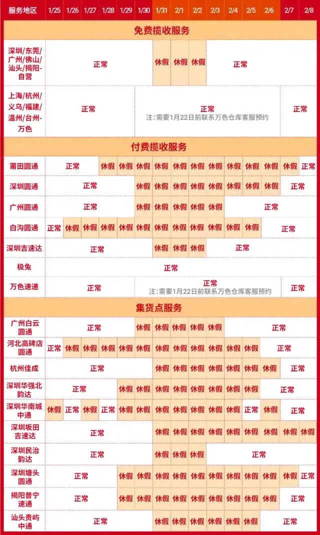 1月31日(除夕) - 2月1日(春节)只收货不做入仓扫描,2月2日(年初二)恢复正常。