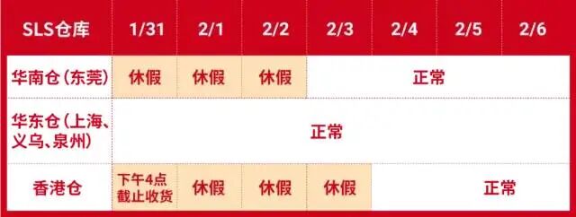 注:①华南仓(东莞)1/31-2/2 仓库可收货(卖家自送、快递送货、货拉拉等),但不做入仓处理。