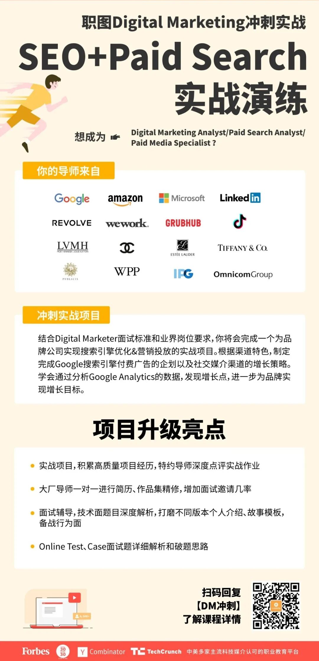 职图Digital Marketing方向冲刺实战项目,旨在填补学校与企业间的知识以及技能的鸿沟。全面学习Digital Marketing方向的细分课程, 在最短时间内,从知识框架(Fundamentals),必备技能(Skill set),到行业趋势发展(Trend)等多个板块帮你打通入行壁垒。同时根据学员背景和求职目标,匹配合适的一对一导师,手把手带着学员突破简历、面试的层层关卡!