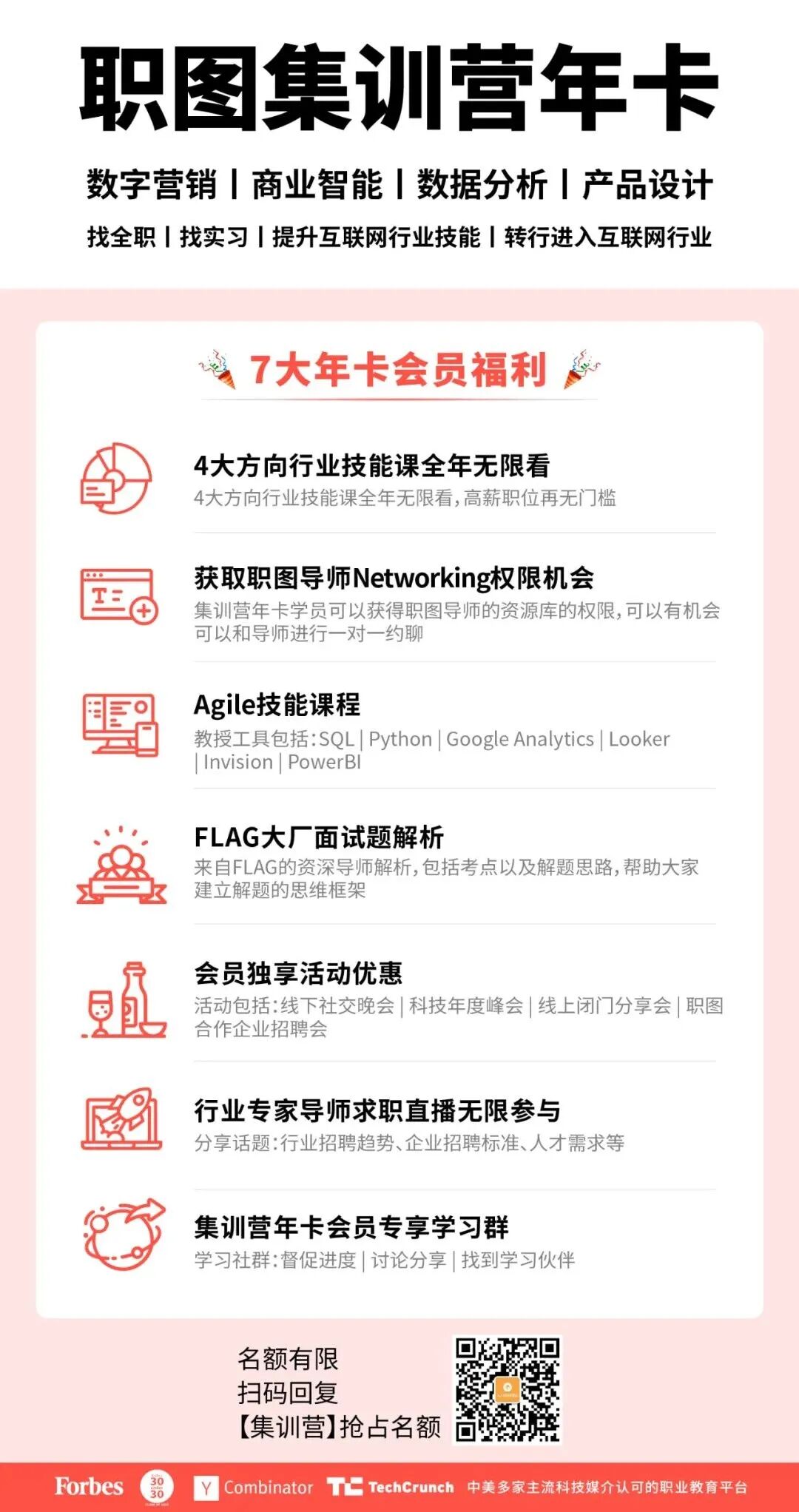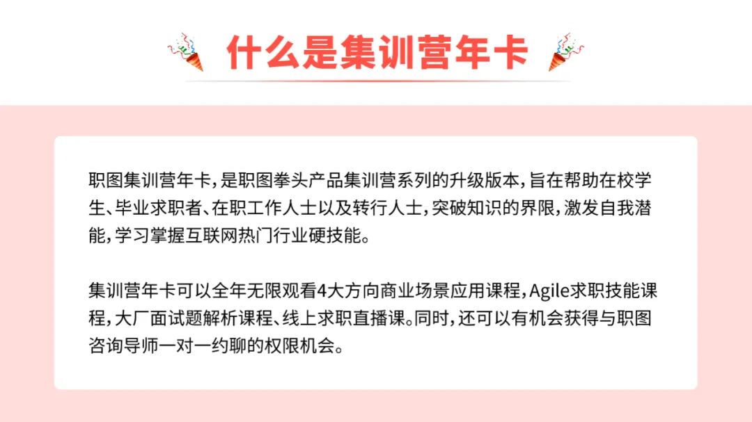 集训营年卡可以全年无限观看4大方向商业场景应用课程,Agile求职技能课程,大厂面试题解析课程、线上求职直播课。同时,还可以有机会获得与CareerTu咨询导师一对一约聊的权限机会。