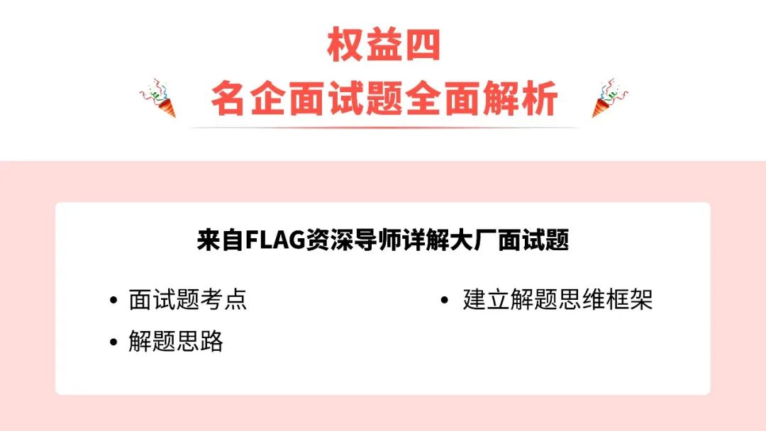 来自FLAG的资深导师为你详细解析大厂面试题,剖析面试题目考点,梳理解题思路,帮助同学建立解题的思维框架。