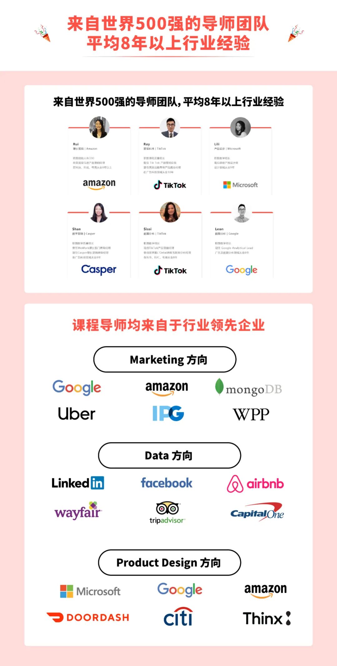 集训营年卡的课程导师背景过硬,均在科技、时尚、金融、快消、营销、金融等行业有多年工作经验,拥有丰富的业界知识、工作方法和经验。