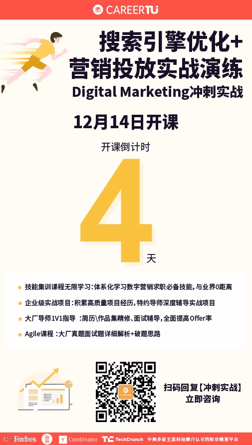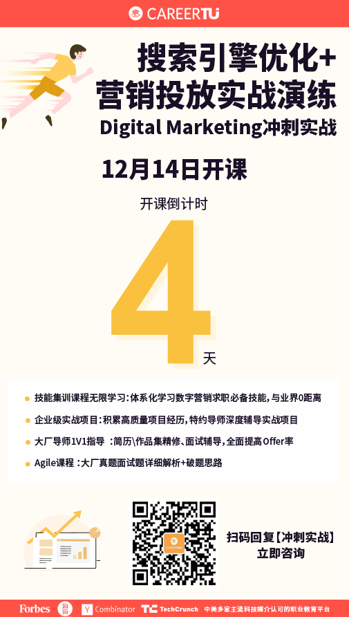 职图Digital Marketing方向冲刺实战项目,旨在填补学校与企业间的知识以及技能的鸿沟。全面学习Digital Marketing方向的细分课程, 在最短时间内,从知识框架(Fundamentals),必备技能(Skill set),到行业趋势发展(Trend)等多个板块帮你打通入行壁垒。同时根据学员背景和求职目标,匹配合适的一对一导师,手把手带着学员突破简历、面试的层层关卡!