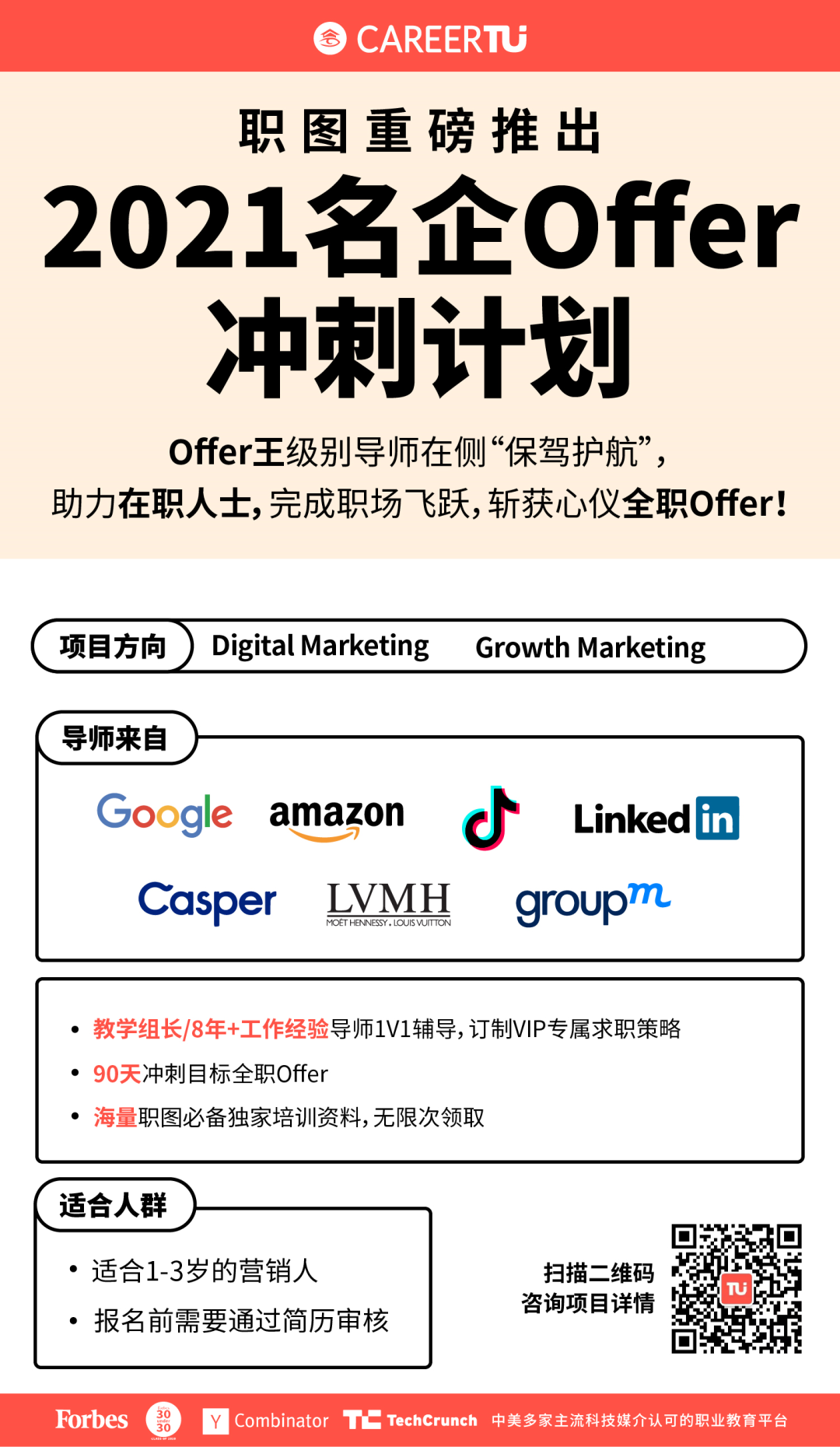 职图名企Offer冲刺计划,针对具有1-3年工作经验,想要在2021年冲刺大厂Digital Marketing、Growth Marketing岗位的同学,邀请到Google, Amazon, LÓreal, LVMH, Tiffany 等领先公司的业界资深导师,全方位地构建互联网营销洞察体系,冲刺大厂一线Offer!