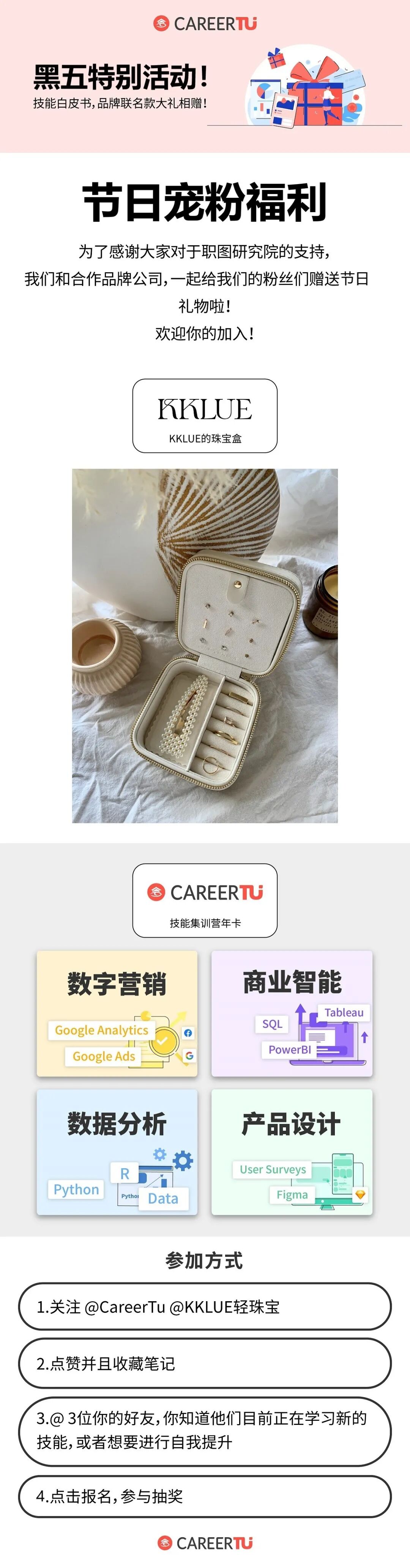 我们将在满足以上条件的小红薯中,随机抽出一位送出KKLUE价值399RMB的珠宝盒一个,一位送出CareerTu价值 $1050的集训年卡一张。
