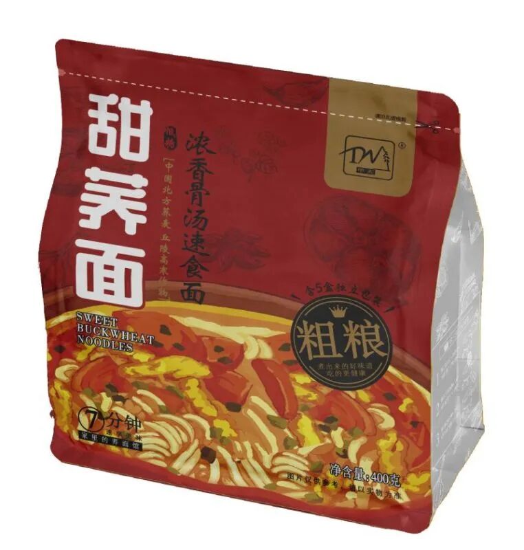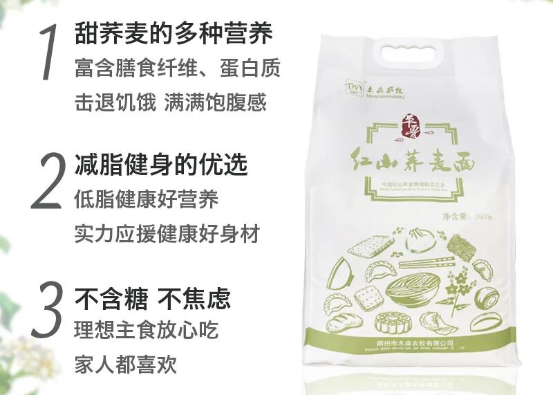 红山甜荞速食面采用优质红山荞麦经传统石磨磨面,采用新型加工工艺纯手工制作,在保证其原材料中营养元素及膳食纤维不被破坏的同时,做到荞麦面含量达70%。煮熟的面条柔软爽口,汤色呈清亮的黄绿色。解决了千家万户不会做荞面食品的困扰,也满足了现代人快节奏的生活方式。