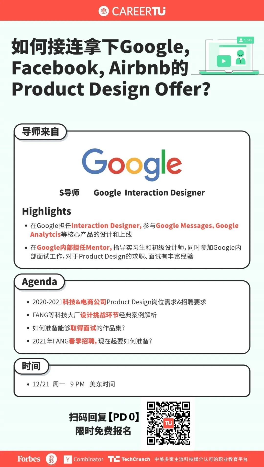 在Google内部担任Mentor,指导实习生和初级设计师,同时参加Google内部面试工作,对于Produce Design的求职、面试有丰富经验