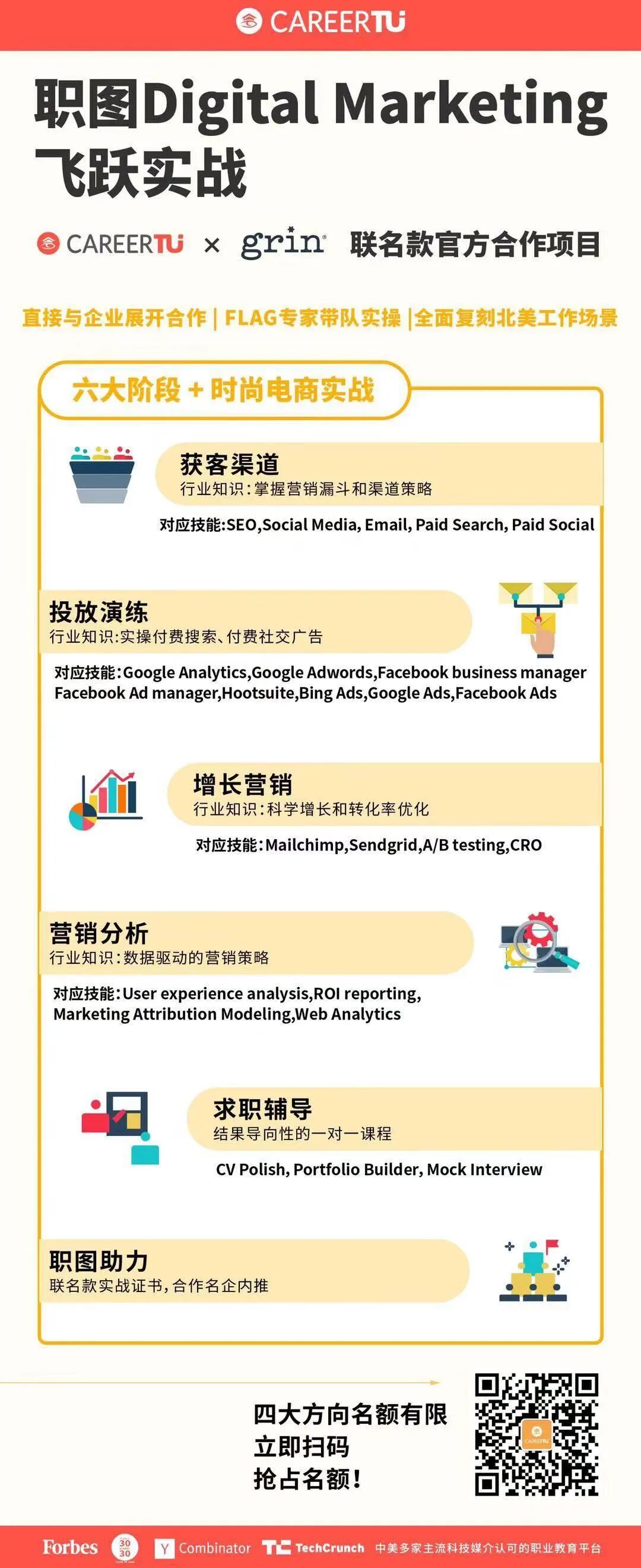1.直接与电商企业Grin展开合作,深度参与职图联名款商业项目,获取高质量真实项目实操经历,为你之后求职以欧莱雅、Amazon、Wayfair、Everlane为代表的电商公司数字营销岗位奠定基础。