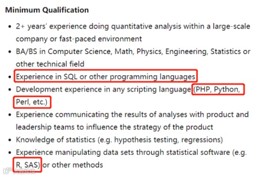 和上面的第六点刚好是相反的道理,在你软知识没有问题的基础上,你的硬技能就需要增强了。如果是Entry Level的同学想求职Marketing Analytics方向的工作,最最基础的工具使用就包括了Excel和SQL。
