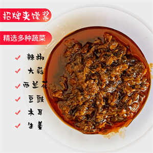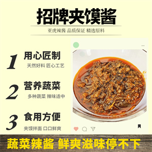料,精选大蒜、辣椒、豆豉、生姜、木耳、西兰花等多种蔬菜,精选每一种食材,把关每一道工序,提供优质的营养夹馍酱。营养蔬菜夹馍酱,鲜爽滋味享不停。夹馍酱推荐食用方法:佐饭、拌饭、拌面、夹馍、饼子、手抓饼、凉拌菜,口感独特,辣味适中,一勺定美味!