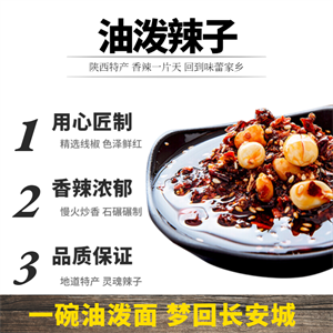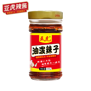 油泼辣子是亚虎辣酱主打产品之一,采用国家地理标志认定的陕西兴平线椒作为原材料,真材实料,精选新鲜食材,色泽鲜红,鲜辣不上过,精选每一种食材,把关每一道工序,只为提供给消费者更美,更纯粹的老陕味道。产品被中国蔬菜流通协会评为中国好食材,油泼辣子适合佐饭、夹馍、饼子、凉拌菜、蘸汁、拌面等等。陕西兴平辣椒富含多种维生素、芳香油、脂肪、蛋白质和钙、磷、铁等各种营养成份,在一些国家有“红色药材”之称。在民间流传一句,陕西关中八大怪,油泼辣子一道菜,醮馍拌菜调干面,嘴巴一抹嘹得太。