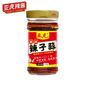 辣子蒜是亚虎辣酱主打产品之一,是一种复合调味酱。辣子蒜采用国家地理标志认定的辣椒大蒜作为原材料,经过多重工序精心酱制,独具风味,蒜香浓郁,辣味清新,那种独特的辣中带着酸甜的味道特别开胃下饭,无论是同米饭、饺子、馒头、饼子还是任何菜肴搭配在一起都非常好吃,可谓是百搭的酱料。辣椒中维生素 C 的含量在蔬菜中居第一位。辣椒的 果实因果皮含有辣椒素而有辣味,能增进食欲,大蒜的辛辣经过精心腌制,保留浓郁的蒜香,不辛辣刺激,经过反复测试推荐食用菜谱:蒸扇贝,虾、鱿鱼等海鲜,辣子蒜排骨、烧烤蘸料、饺子蘸料等。