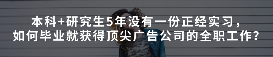 对于刚刚毕业的应届生,广告公司(Agency)还是一个不错的求职方向,因为你能学习到很多行业知识,接触到许多大牌客户。并且广告公司的团队,整体比较年轻,其中一员的你就有很多机会去领导一个项目的部分工作。大的甲方公司不太愿意招聘应届毕业生,职图甚至导师都是在广告公司(Agency)锻炼一段时间,有了经验后,再跳槽到甲方,其中有一位转专业学员在两年的辅导里不断进步,最后进入到了Google。