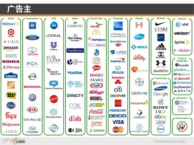 甲方金主爸爸都来自于不同的行业领域,如零售业、银行、汽车行业、快消品业、媒体、餐饮业、科技业、电信业、旅游业、教育业等等。这些甲方公司每年都要拿出庞大的广告费用用于品牌和产品的营销。根据AdAge的数据显示,P&G保洁公司以$105亿美金蝉联头号金主,紧随其后的是三星和雀巢。而中国的阿里巴巴和腾讯,因为广告费用涨幅达到50%和48%,成功斩获涨幅榜的冠军和亚军。并且有数据显示,甲方金主爸爸们的广告预算,越来越多地放到了互联网广告渠道里。