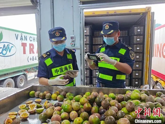 友谊关海关关员正在对进口越南百香果进行检查。赵卫东 摄